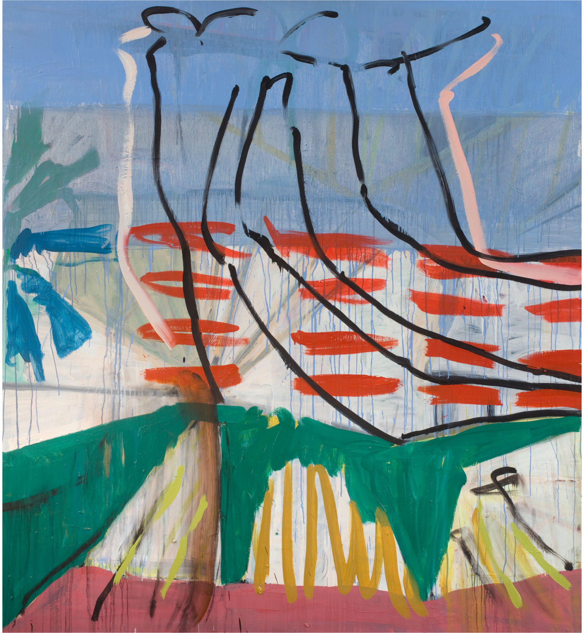 Loose oily wounds and thick emulsions offset light glazes and dribbles, I paint, wipe out, paint over, turn the canvasses around, print, blot, mask, pour paint, scrape and scratch. I shift from one piece to another and don’t focus on completion, just nudging a painting from one position to another.