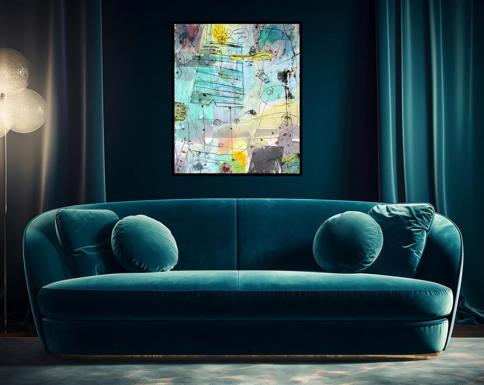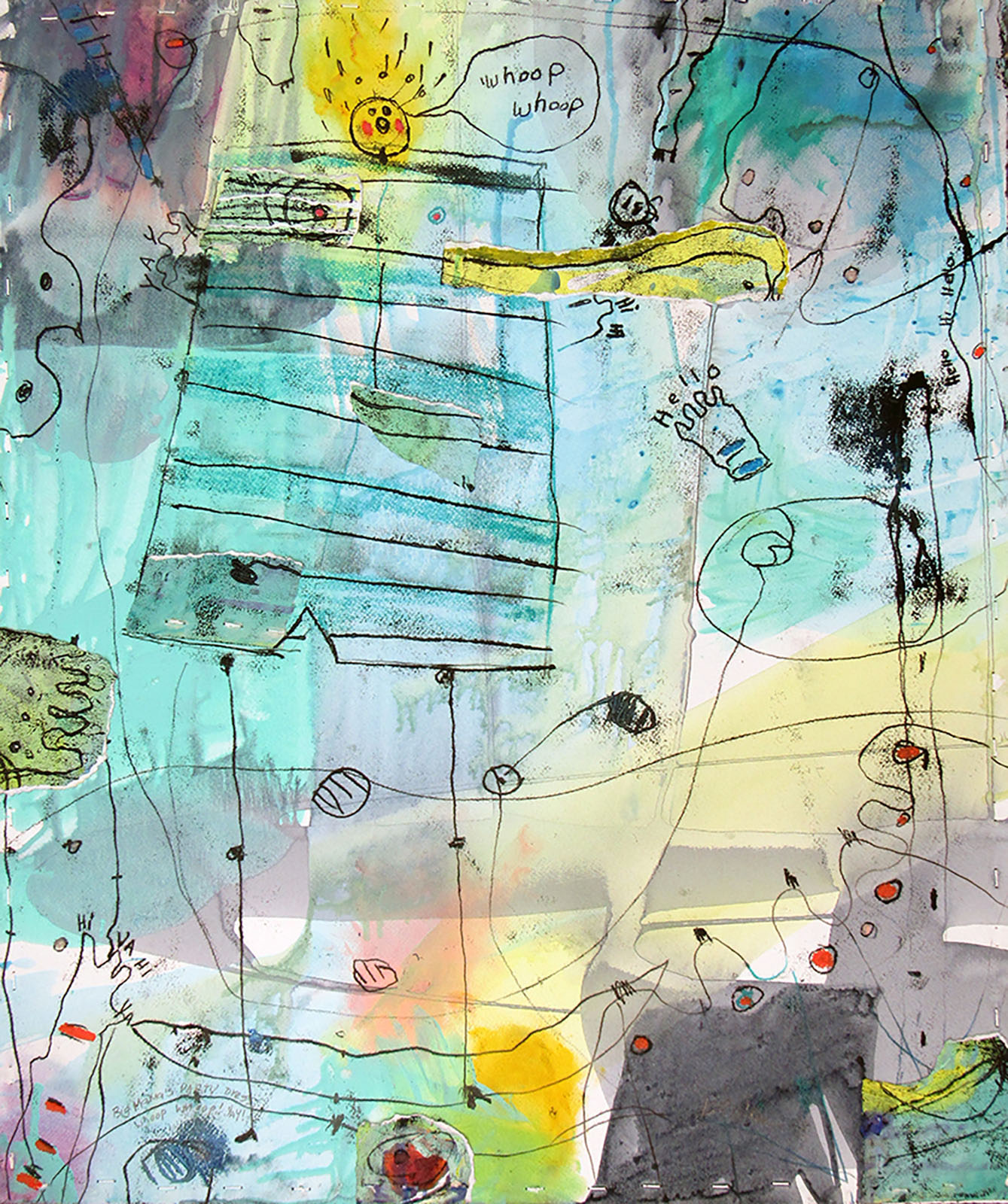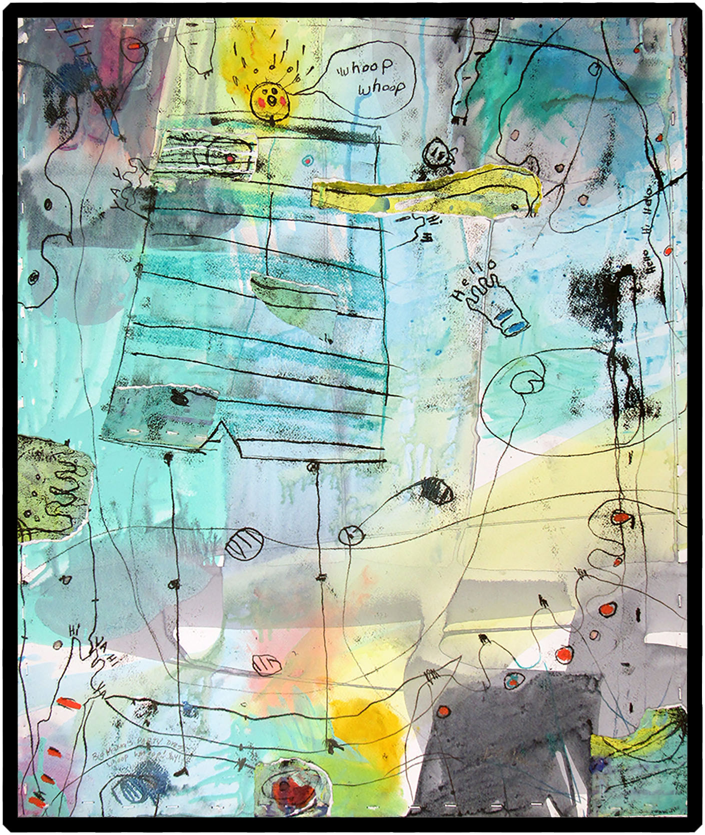 Big Mama’s Party Dress Whoop Whoop YAY! is a mixed media work on paper. It is part of her “Explanation of the Doodle” series. The framed dimensions are 37.5″ x 33″. Unframed dimensions are 27.5″ x 22.75″.  The piece is floated on black with a very dark brown contemporary frame. It is behind glass. For more information and photos please email me!