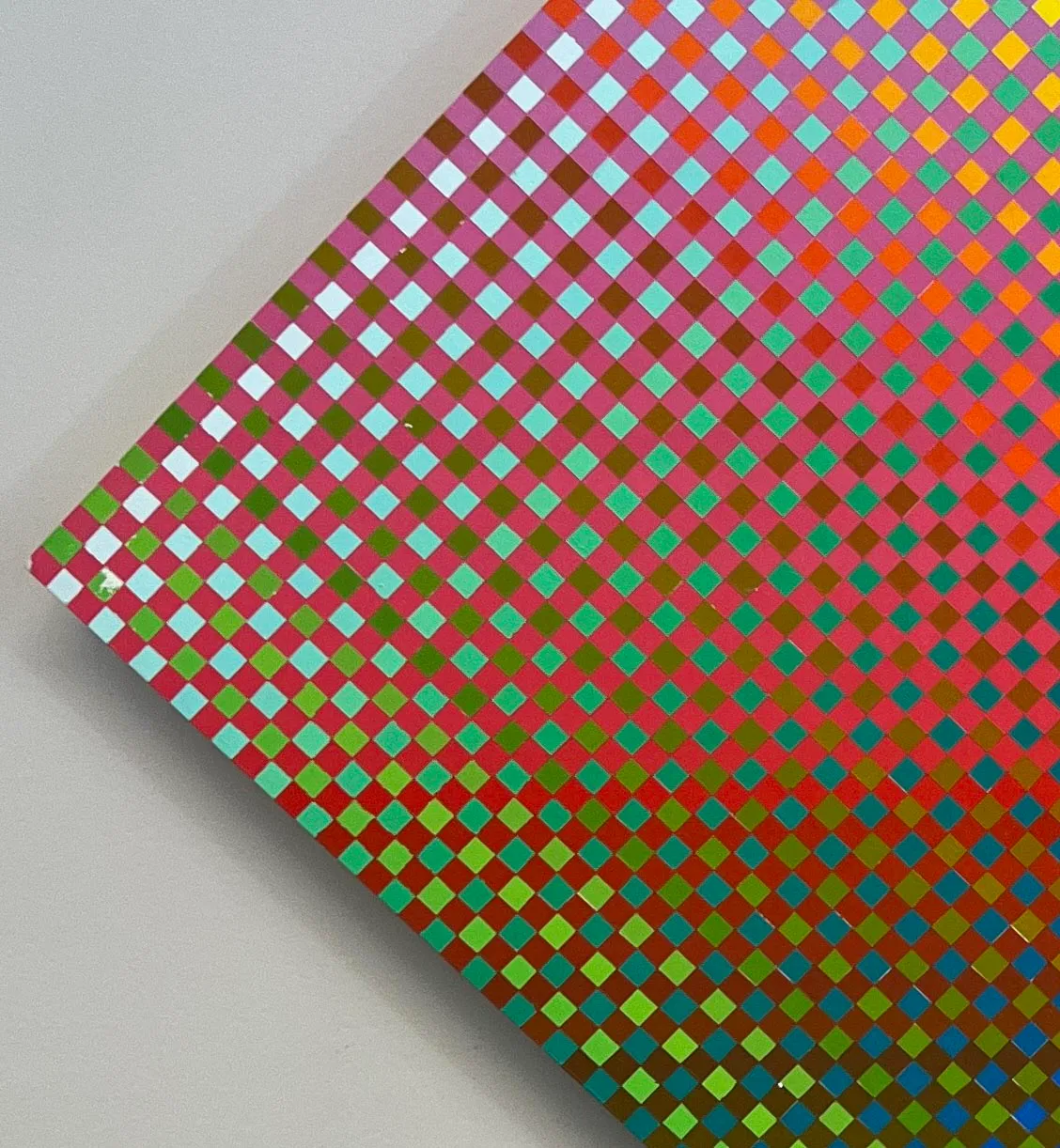 Unlike a Pointillist such as Georges Seurat, who loosely applied dots of paint with a brush, I create each “packet” of color within a grid. This is true to my hardedge abstractionist style.
