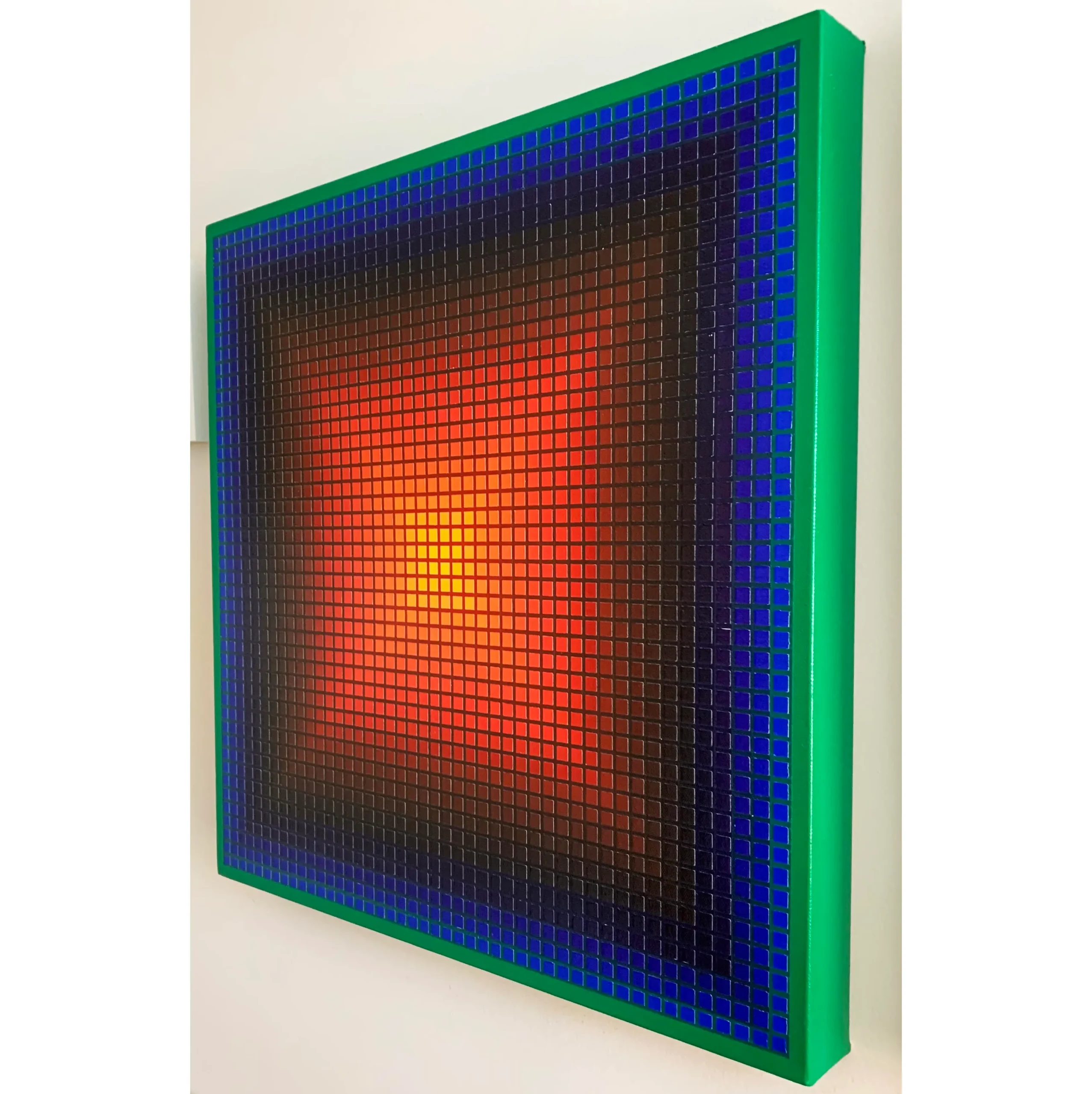 Entitled “Contrapulse Asterism,” (painted April 18, 2020) is an original hardedge abstract acrylic on panel painting. It is part of my “Asterism Series” of contemporary op art works. The term “asterism” refers to the “X” that appears to the eye — but does not exist in the painting — and occurs when contiguous colors interact from light to dark or dark to light. It measures 24” x 24” and is painted on a 2” deep cradle frame. This piece is finished on all sides, so no frame is required.