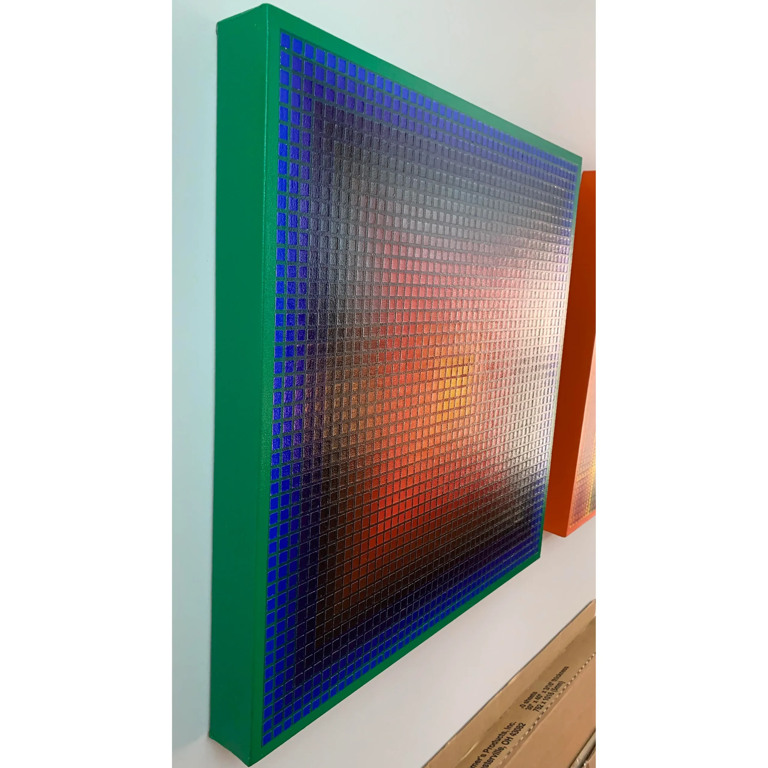 I am influenced by the Op Artists of the 1960s and 1970s — especially Julian Stanczak, Josef Albers, and Richard Anuszkiewicz. I have finished all four sides, so no frame is needed. This piece was exhibited at 59th Annual Community Art Exhibition, Lancaster Museum of Art, Lancaster, PA, August 2021.