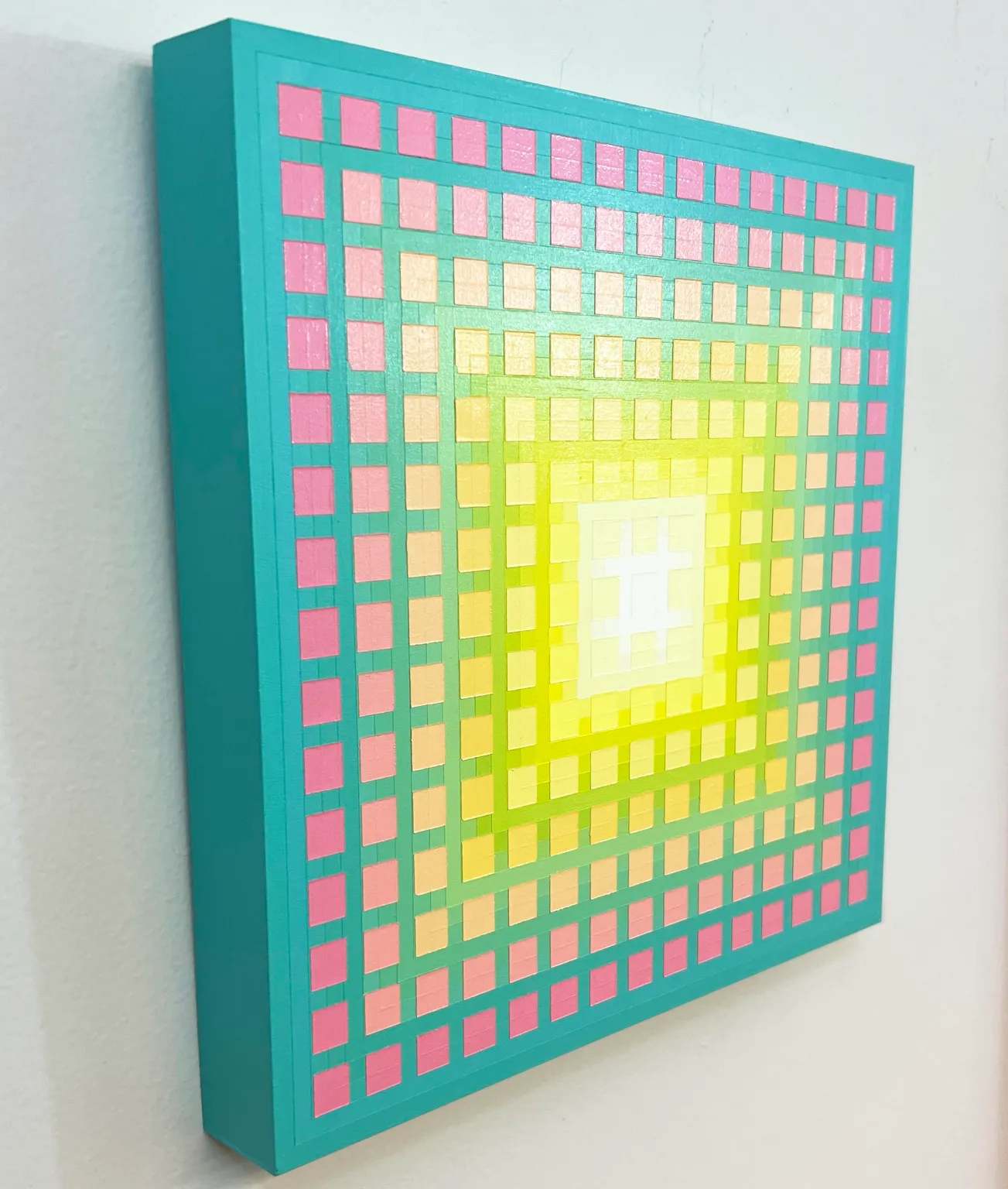 This is an original acrylic on panel op art abstract painting entitled “Gridded Glow Asterism”, created Jan 10, 2025. It measures 12″ X 12″ and is part of my “Asterism Series” of contemporary op art works. The term “asterism” refers to the “X” that appears to the eye — but does not exist in the painting — and occurs when contiguous colors interact from light to dark or dark to light. I am influenced by the Op Artists of the 1960s and 1970s — especially Julian Stanczak, Josef Albers, Carlos Cruz Diez, and Richard Anuszkiewicz. I have finished all four sides, so no frame is needed.