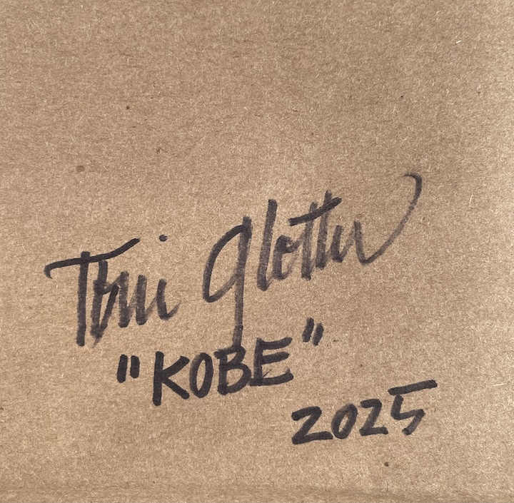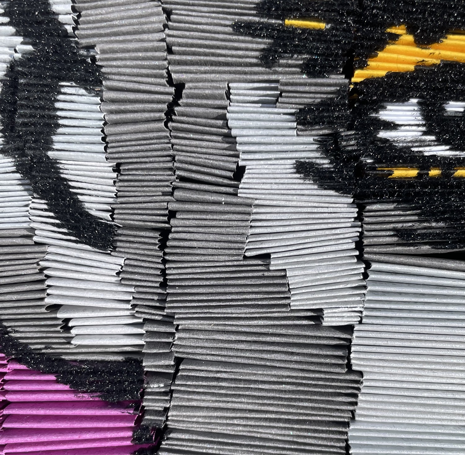 Name / Description: “Kobe” a collage of Kobe Bryant constructed by manipulating cut paper strips, folded and glued to the substrate like pieces of a puzzle. What you see are the folded edges. When stacked the color or tone on the folded edges makeup the image you see.